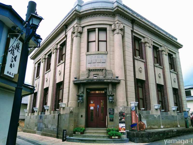 豊前街道の坂道を少し登っていった場所にあるのが山鹿灯籠民芸館です。大正時代の銀行の建物で、その時代の建築様式を見ることができる場所でもあります。
